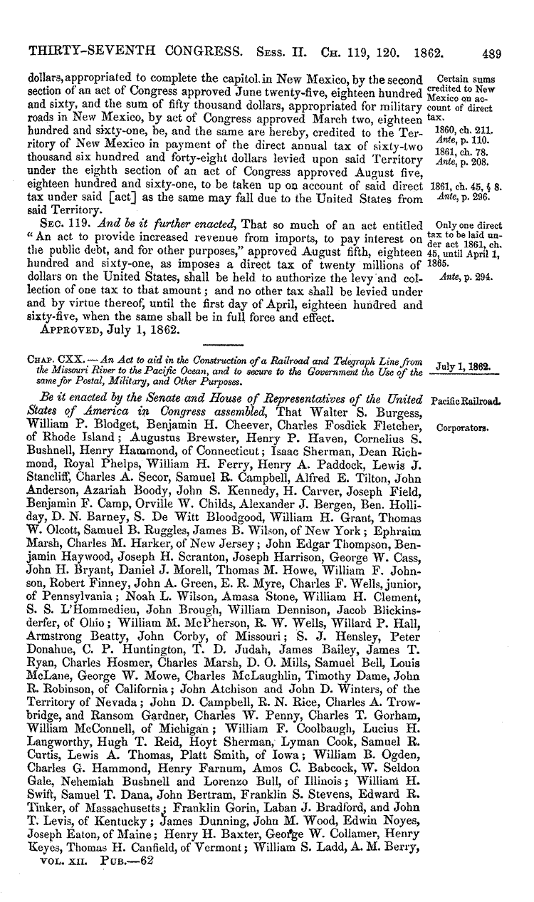 "An act to aid in the construction of a railroad and telegraph line from the Missouri river to the Pacific ocean, and to secure to the government the use of the same for postal, military, and other purposes," Abraham Lincoln(Act of March 3, 1862.)